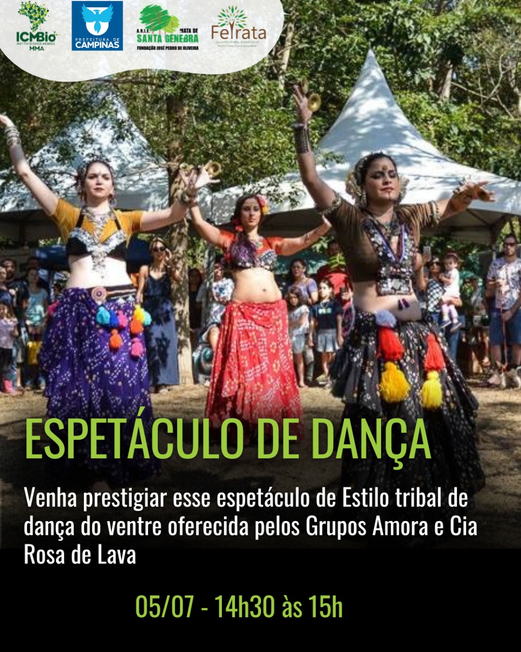 Apresentação de Estilo tribal de dança do ventre- uma dança de fusão (Grupos - Amora e Cia Rosa de Lava) . O estilo tribal reúne diversas danças femininas de culturas diferentes em uma única apresentação em improviso coordenado. Por meio de uma fusão entre a dança do ventre, o flamenco e as danças indianas, essa dança busca a valorização das movimentações e dos corpos femininos, do trabalho em grupo e da sororidade entre mulheres por meio da arte e de uma estética únicas! .
