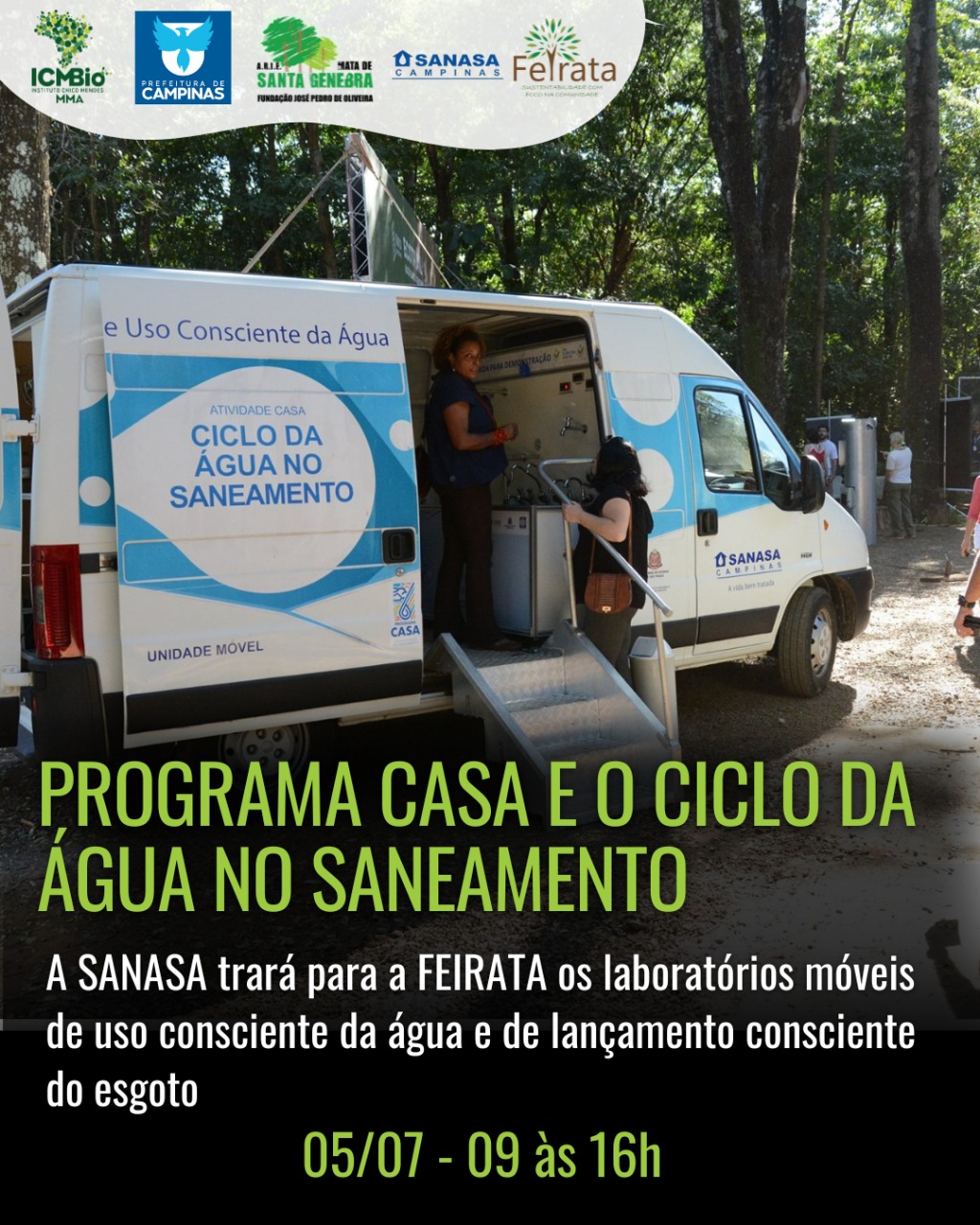 O programa CASA trará os laboratórios móveis de uso consciente da água e de lançamento consciente do esgoto. Será apresentado o sistema de abastecimento de água e esgotamento sanitário assim como equipamentos e dispositivos que inibem desperdícios de água e preservam o sistema de esgoto domiciliar e público. Pretende-se, sobretudo, prestar esclarecimentos sobre hábitos e atitudes que possam colaborar com o bom funcionamento do sistema público e com as instalações prediais de seu imóvel. A atividade é realizada pela SANASA.