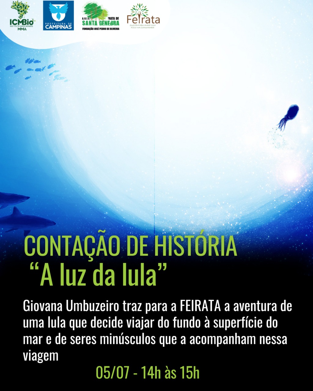 A contação será realizada por Giovana Umbuzeiro Valent (Epifania Livros - @epifanialivros). O Livro A luz da lula é inspirado na bactéria luminescente Vibrio fisheri, utilizada para avaliação da qualidade da água. A capa brilha no escuro e a atividade é realizada sob a luz negra.