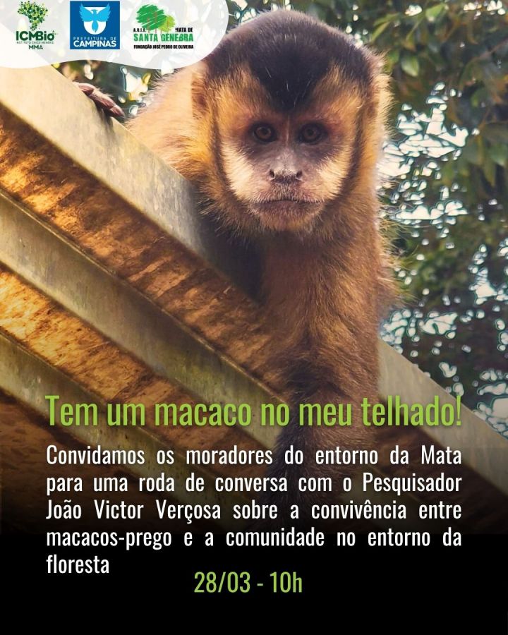 A Fundação José Pedro de Oliveira convida os moradores do entorno da ARIE Mata de Santa Genebra para uma roda de conversa com o pesquisador João Victor Verçosa sobre a relação entre os macacos-prego e as comunidades que vivem no entorno da Floresta.