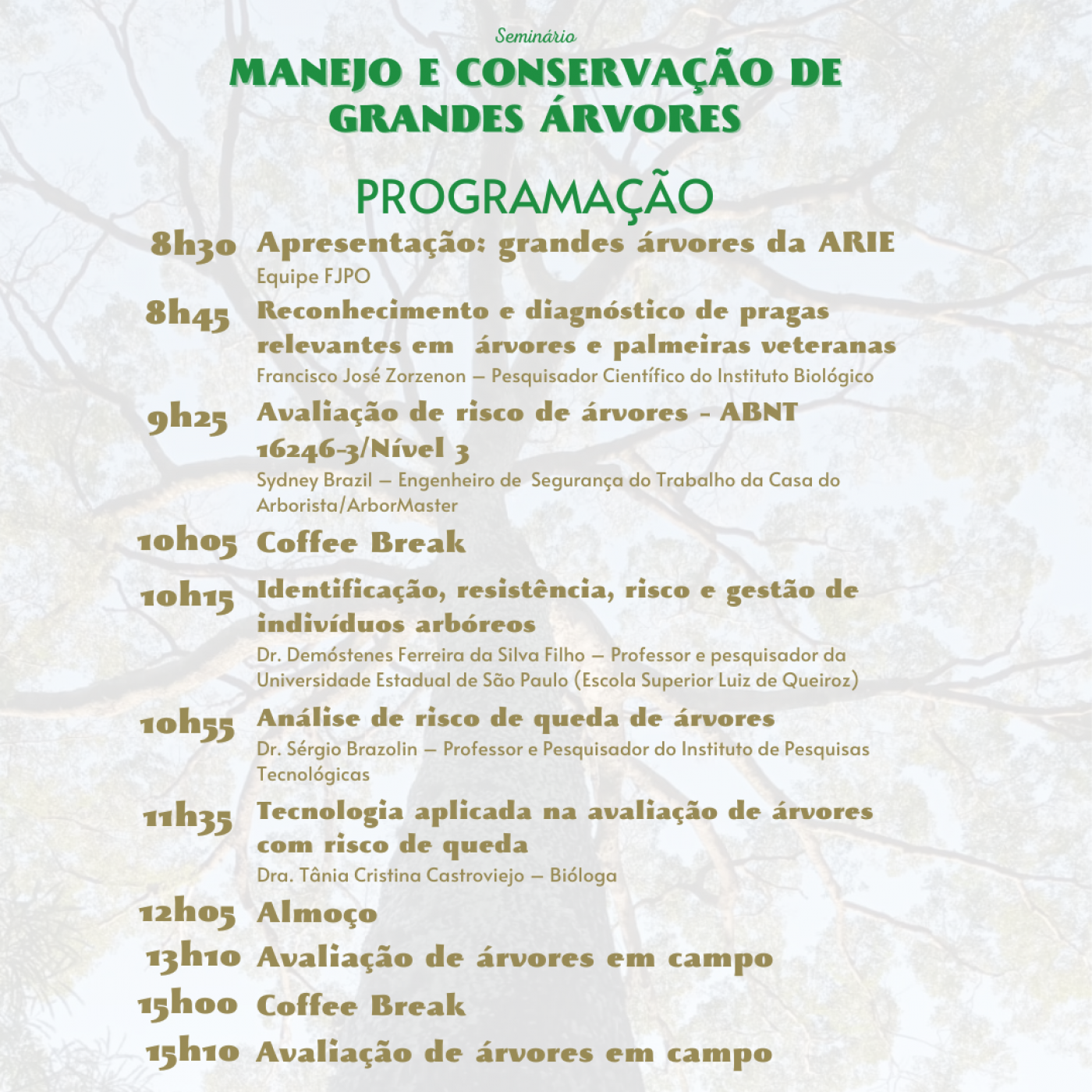Com o Seminário "MANEJO E CONSERVAÇÃO DE GRANDES ÁRVORES", voltado para profissionais da área, buscamos promover a troca de conhecimento visando a melhor forma de conservar esses indivíduos centenários em ambientes naturais.